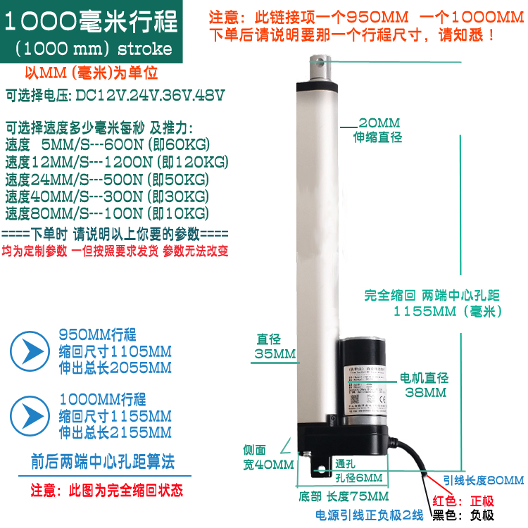 铁甲虫电动推杆220V12v24v1000MM行程升降杆微型电动伸缩杆直流开窗器推拉推杆电机